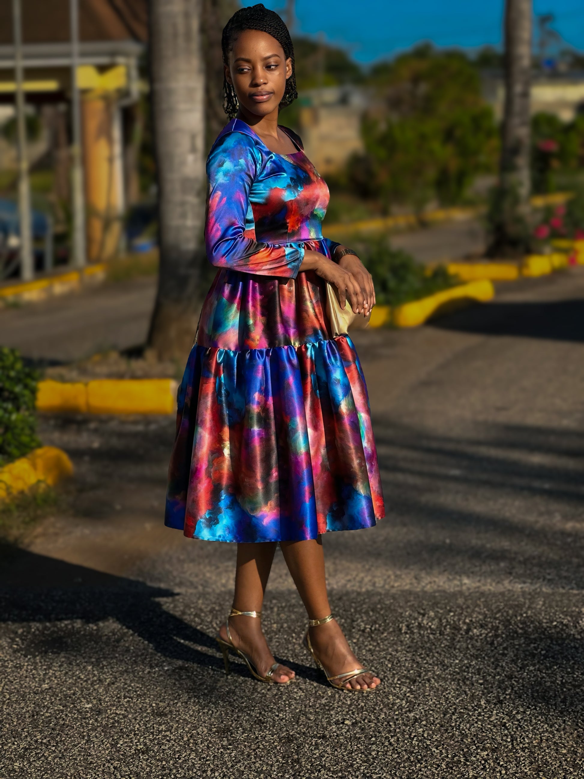 Description A celebration of color, grace, and effortless femininity. The Aurora Tiered Midi Dress features a rich, painterly blend of jewel tones that flow seamlessly across a structured yet comfortable silhouette. Designed with a modest square neckline and long fitted sleeves, this dress offers timeless elegance while allowing the vibrant print to take center stage.